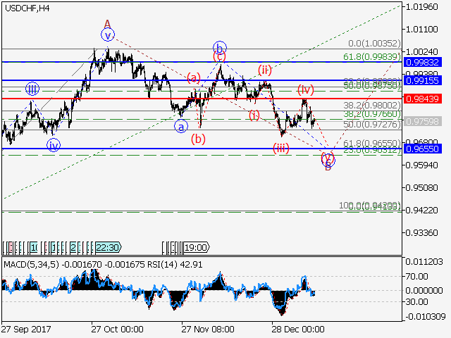Analysis: Supposedly, a descending correction of senior level in the form of the wave B continues to form within the 4-hour time frame. Apparently, the wave (c) of ii is developing at the moment, with the wave (v) of c forming inside. If this assumption is correct, the pair will go on dropping to the level of  0.9655. The level 0.9843 is critical in this scenario.
